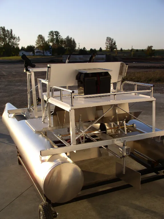 All of the fifteen-inch diameter pontoon boats are available or can be retrofitted with the electric motor drive unit that provides quiet operation with zero maintenance. The electric motor drive serves as an excellent emergency backup for older folks or an efficient trolling motor for the fisherman. The electric motor drive has a clutch system incorporated into the chain drive to power the paddlewheel aassembly. Should the paddlewheel become jammed there is a circuit breaker that will safely shut down the motor drive. Using the hand lever that mounts on the seat frame one may either allow the motor drive to power the paddle boat or assist the pedaling of the operator. The solar charger is provided as standard equipment and as a result the battery will need little or no maintenance during the course of the season. There is a key switch to prevent unwanted use of the boat with the motor.