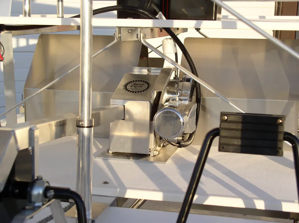 Once the motor is turned on, the drive is engaged by pressing the drive lever, located on the right armrest. Pressure must be maintained on the handle to keep the paddlewheel drive engaged. Minimum effort is required.